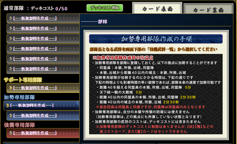 通常の部隊編成で使用する6部隊とは別に、「加勢」限定で使用できる部隊となります。
