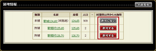 同盟員以外からの加勢を「許可する」「許可しない」を選ぶことができます。