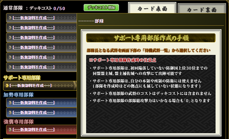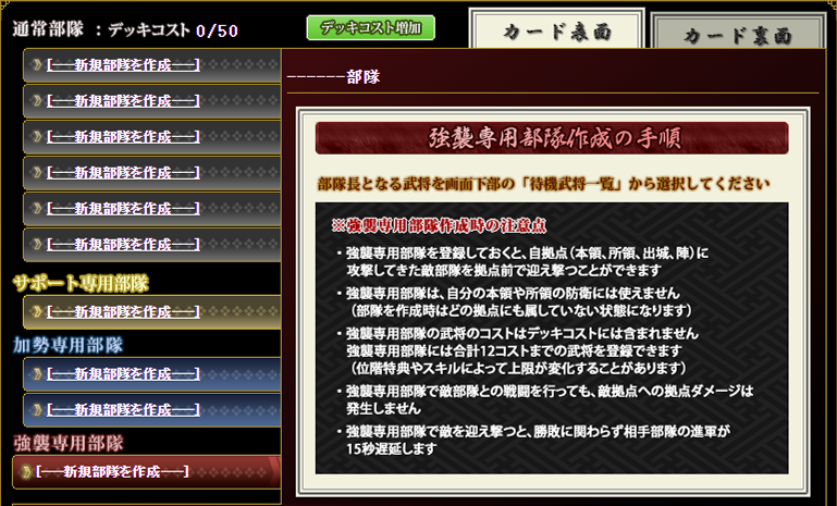 注:「同じカードNoの武将」や「同じ名前の武将」は、同時に部隊にセットすることができません。(一部例外カードも存在します。)