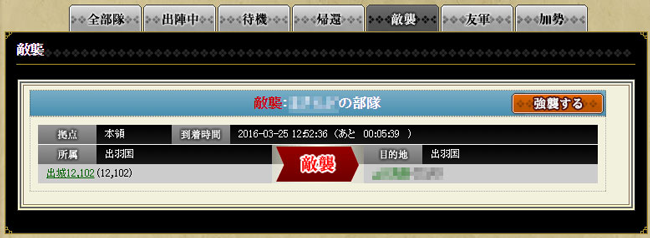 現在、自分が所有している部隊の状況や、自分の拠点への加勢部隊の状況を確認できます。